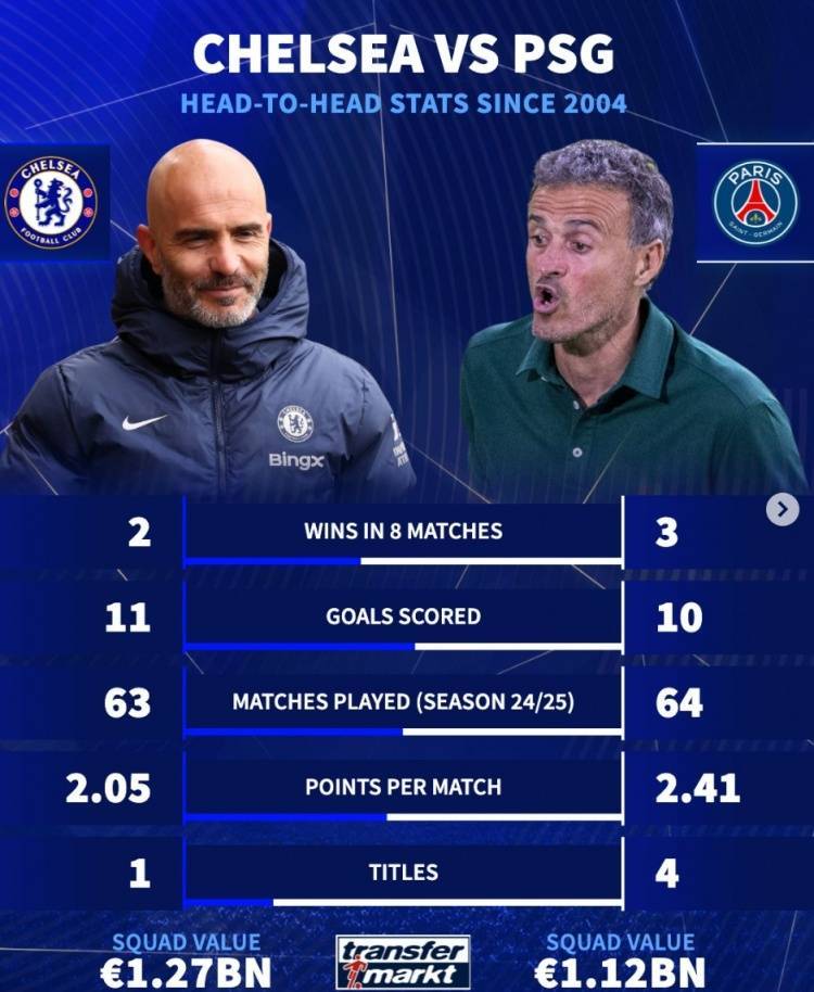 两队自2004年以来共计在各项赛事交锋8次,切尔西打进11球、取得2胜,巴黎打进10球、取得3胜,其余3场比赛握手言和。